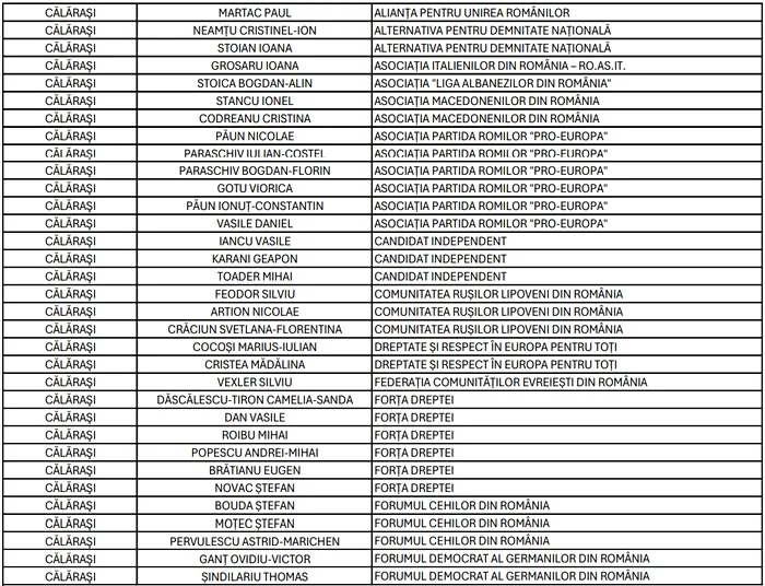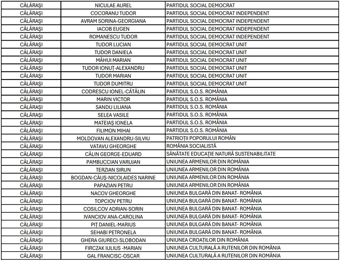 În Călărași, ordinea partidelor pe buletinul de vot, la Senat și la Camera Deputaților, a fost stabilită prin tragere la sorți. În total, 54 de candidați se luptă pentru un loc în Senatul României, din partea a 20 partide.