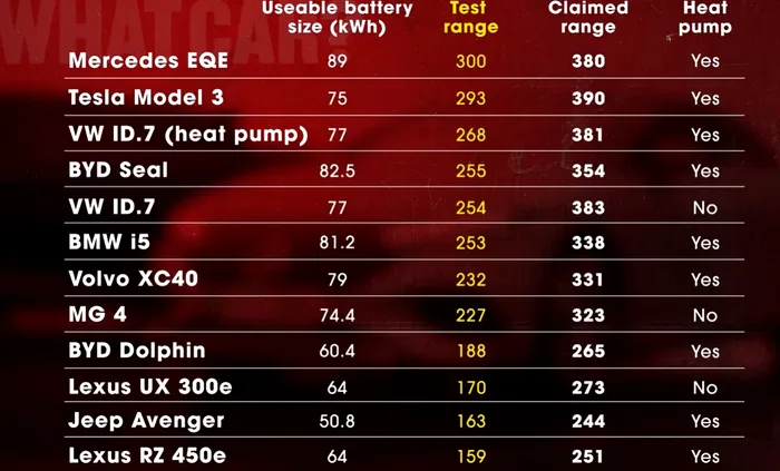 Temperatura în fiecare din mașinile electrice testate a fost setată la 21 de grade Celsius. Au fost puse la grele încercări modelele Tesla Model 3, BYD Dolphin, MG4, VW ID.7, BYD Seal RWD, BMW i5 eDrive40 M Sport Pro și Jeep Avenger Summit.