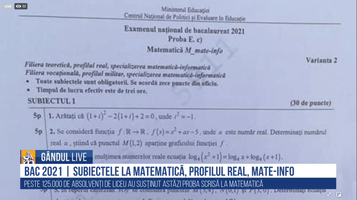 Subiectele primite de absolvenții de liceu la proba de Matematică de la Bacalaureat 2021 au fost rezolvate LIVE pe Gândul.ro de profesorul Luigi Ionuț Catana, de la Liceul Teoretic ”Horia Hulubei”.