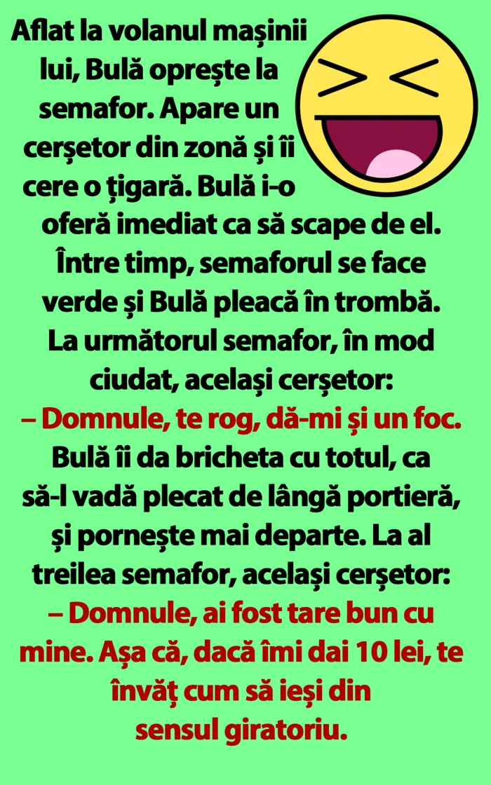 – Domnule, ai fost tare bun cu mine. Așa că, dacă îmi dai 10 lei, te învăț cum să ieși din sensul giratoriu.