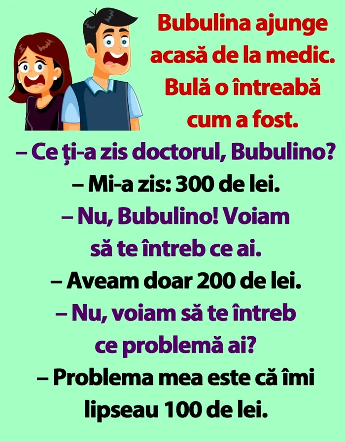 Ziua de Duminică este dedicată relaxării și bunei dispoziții. Redacția Gândul vă aduce un zâmbet pe buze cu un banc în care facem haz de necaz de prețurile tot mai mari pentru o consultație la medic.