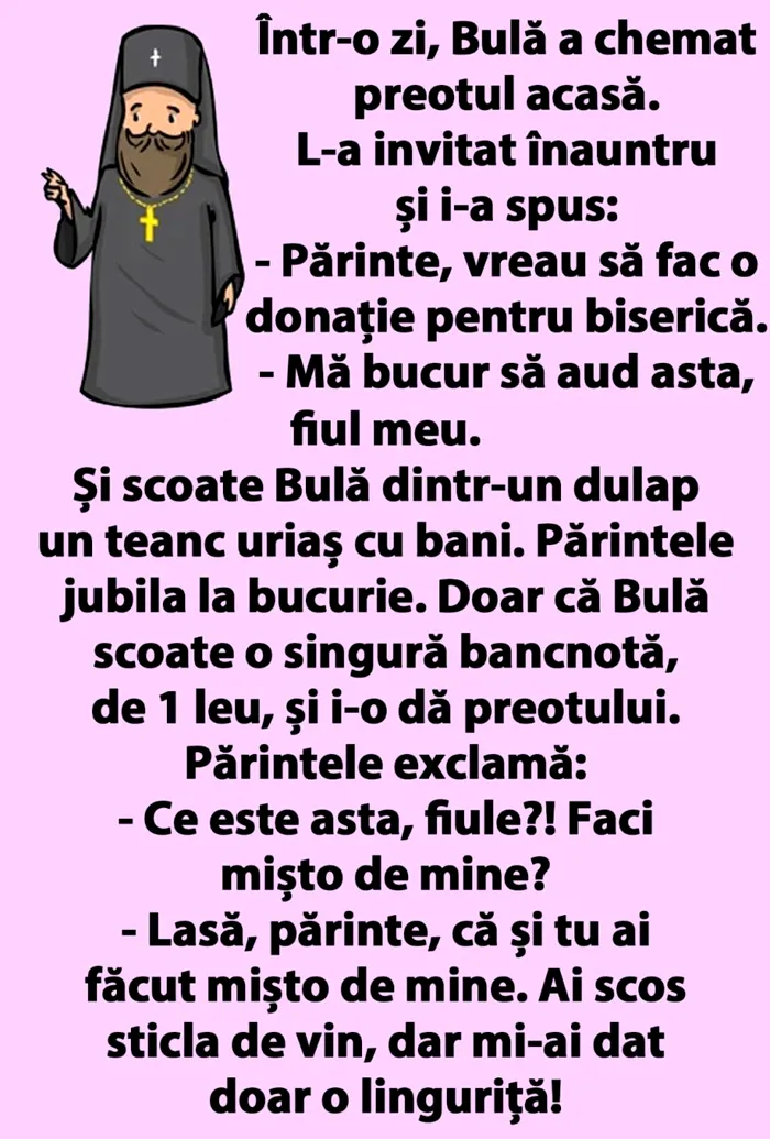 – Lasă, părinte, că și tu ai făcut mișto de mine. Ai scos sticla de vin, dar mi-ai dat doar o linguriță!