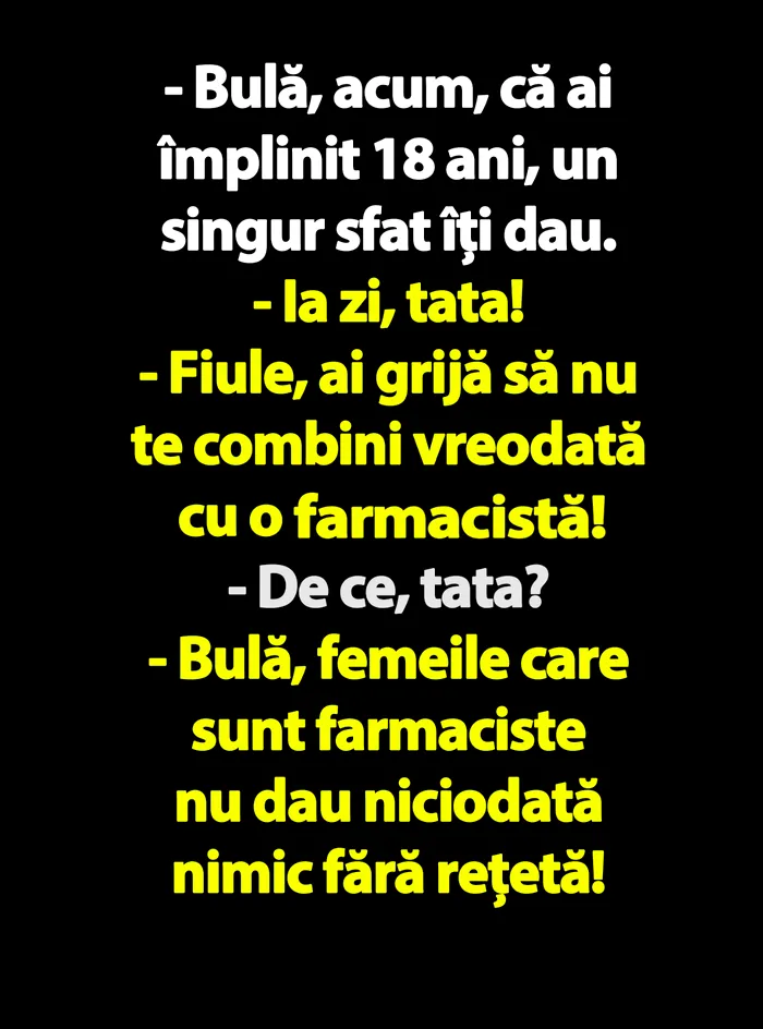 – Bulă, femeile care sunt farmaciste nu dau niciodată nimic fără rețetă!