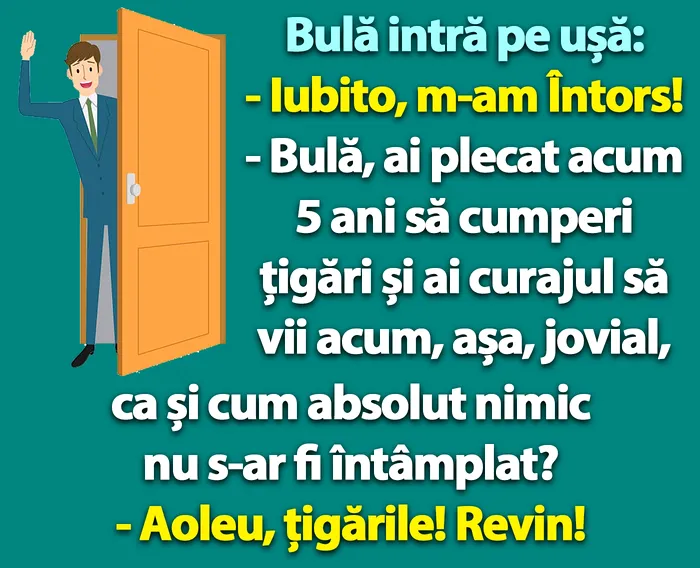 – Bulă, ai plecat acum 5 ani să cumperi țigări și ai curajul să vii acum, așa, jovial, ca și cum nimic nu s-ar fi întâmplat?