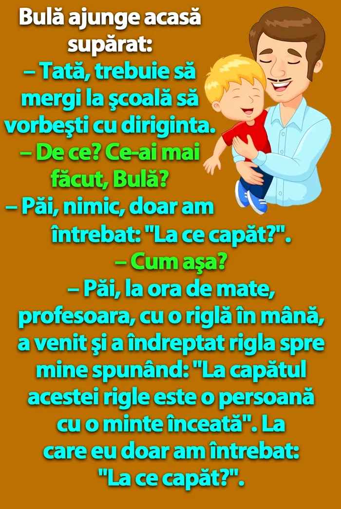 – Păi, la ora de mate, profesoara, cu o riglă în mână, a venit şi a îndreptat rigla spre mine spunând: „La capătul acestei rigle este o persoană cu o minte înceată”. La care eu doar am întrebat: „La ce capăt?”.