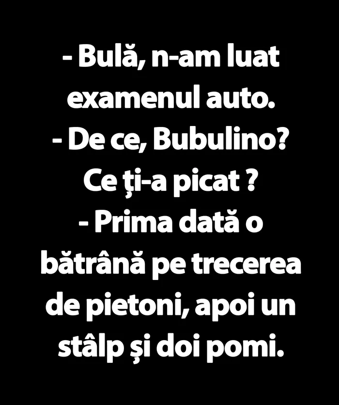 – Bulă, n-am luat examenul auto.