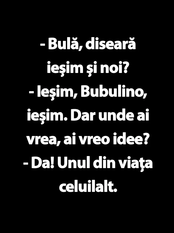 – Ieșim, Bubulino, ieșim. Dar unde ai vrea, ai vreo idee?