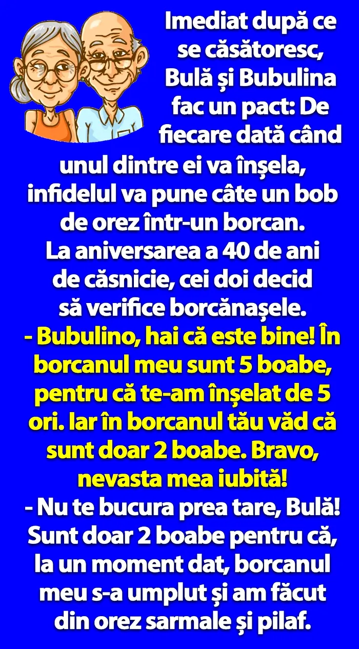 Dacă ești curios să citești bancul zilei, propus de noi, afli că – imediat după ce s-au căsătorit – Bulă și Bubulina au făcut un pact: De fiecare dată când unul dintre ei va înșela, infidelul va pune câte un bob de orez într-un borcan, iar la aniversarea a 40 de ani de căsnicie, cei doi decid să verifice borcănașele.