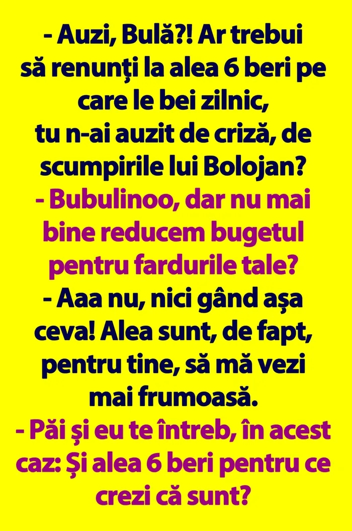 – Auzi, Bulă?! Ar trebui să renunți la alea 6 beri pe care le bei zilnic, tu n-ai auzit de criză, de scumpirile lui Bolojan?