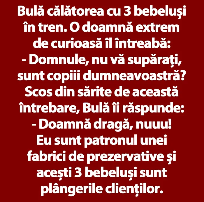– Doamnă dragă, nuuu! Eu sunt patronul unei fabrici de prezervative și acești 3 bebeluși sunt plângerile clienților.