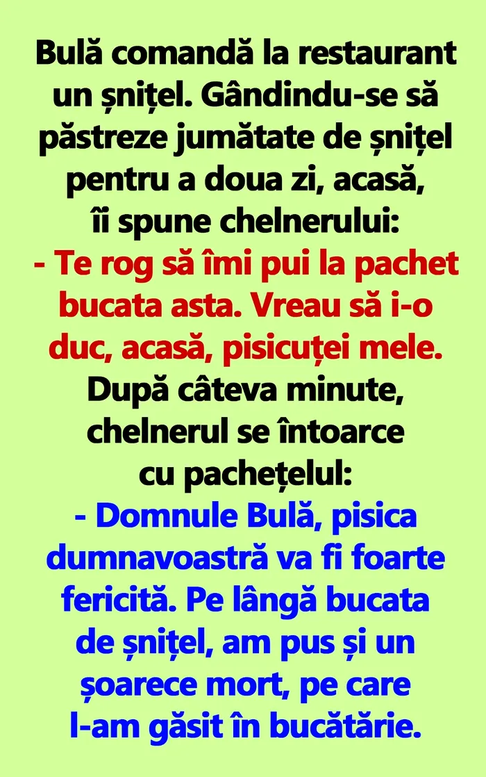 – Domnule Bulă, pisica dumnavoastră va fi foarte fericită. Pe lângă bucata de șnițel, am pus și un șoarece mort, pe care l-am găsit în bucătărie.