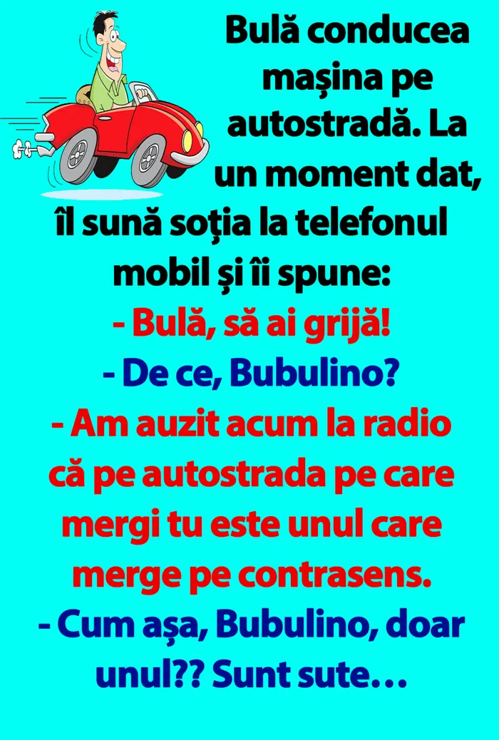 Bulă conducea mașina pe autostradă. La un moment dat, îl sună soția la telefonul mobil și îi spune: