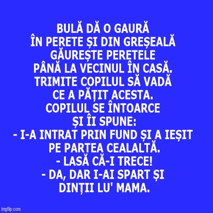 Bulă dă o gaură în perete și din greșeală găurește peretele până la vecinul în casă. Trimite copilul să vadă ce a pățit acesta. Copilul se întoarce și îi spune: