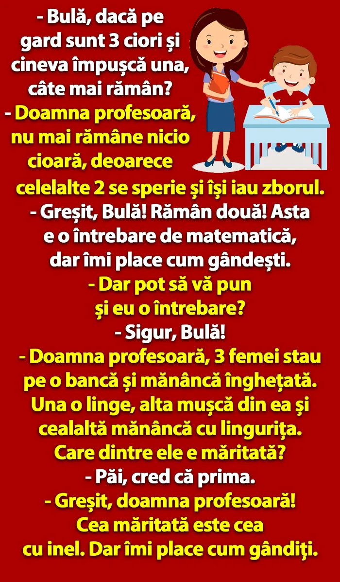 – Greșit, doamna profesoară! Cea măritată este cea cu inel. Dar îmi place cum gândiți.