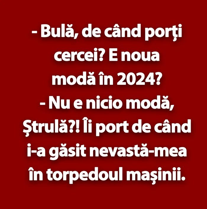– Nu e nicio modă, Ștrulă! Îi port de când i-a găsit nevastă-mea în torpedoul mașinii.