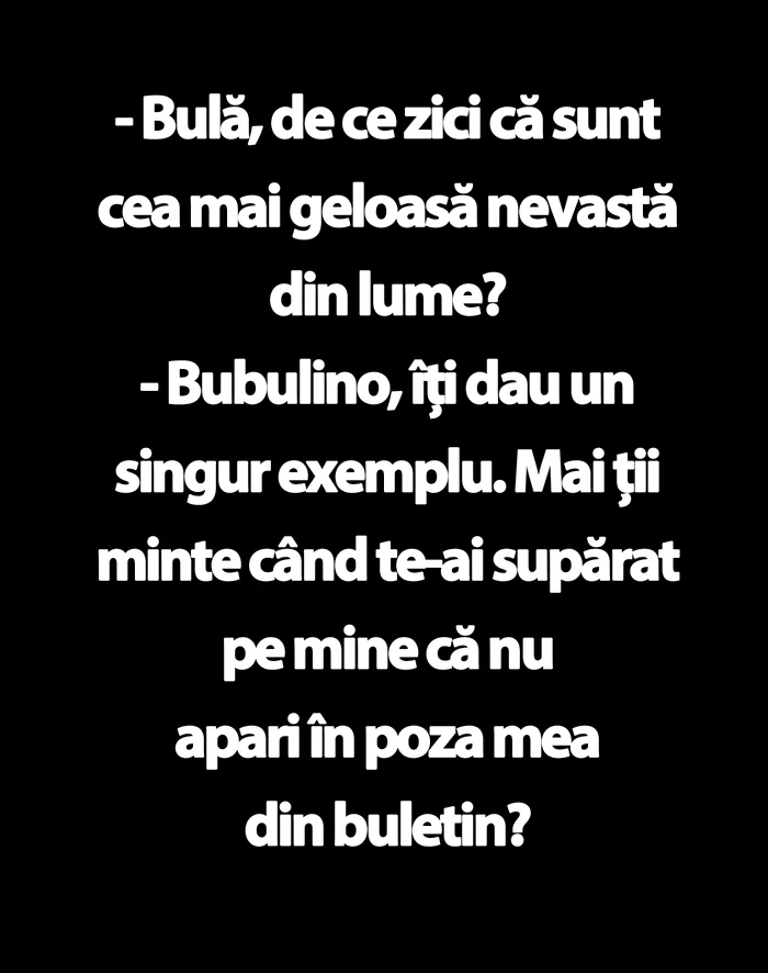 – Bubulino, îți dau un singur exemplu. Mai ții minte când te-ai supărat pe mine că nu apari în poza mea din buletin?