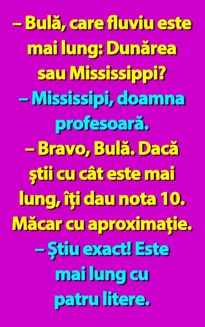 – Bulă, care fluviu este mai lung: Dunărea sau Mississippi?