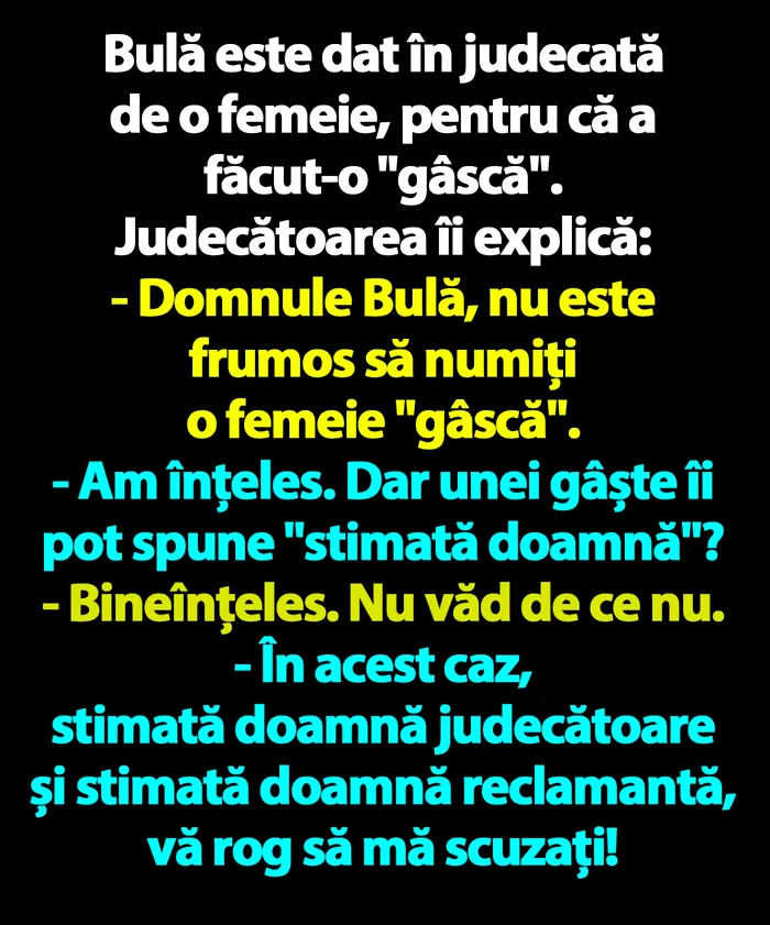 – Domnule Bulă, nu este frumos să numiți o femeie ”gâscă”.