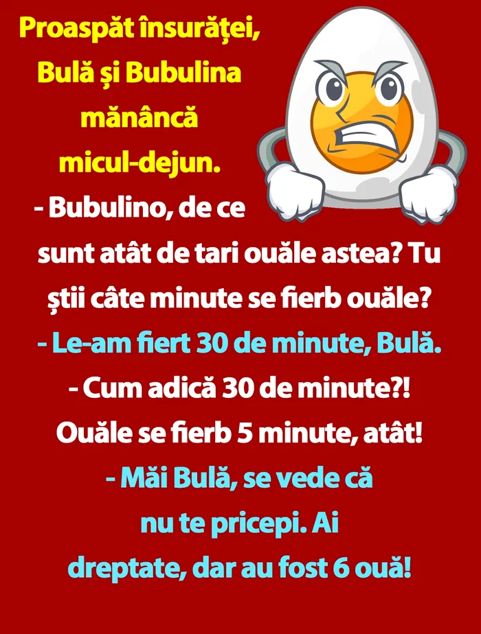 – Bubulino, de ce sunt atât de tari ouăle astea? Tu știi câte minute se fierb ouăle?