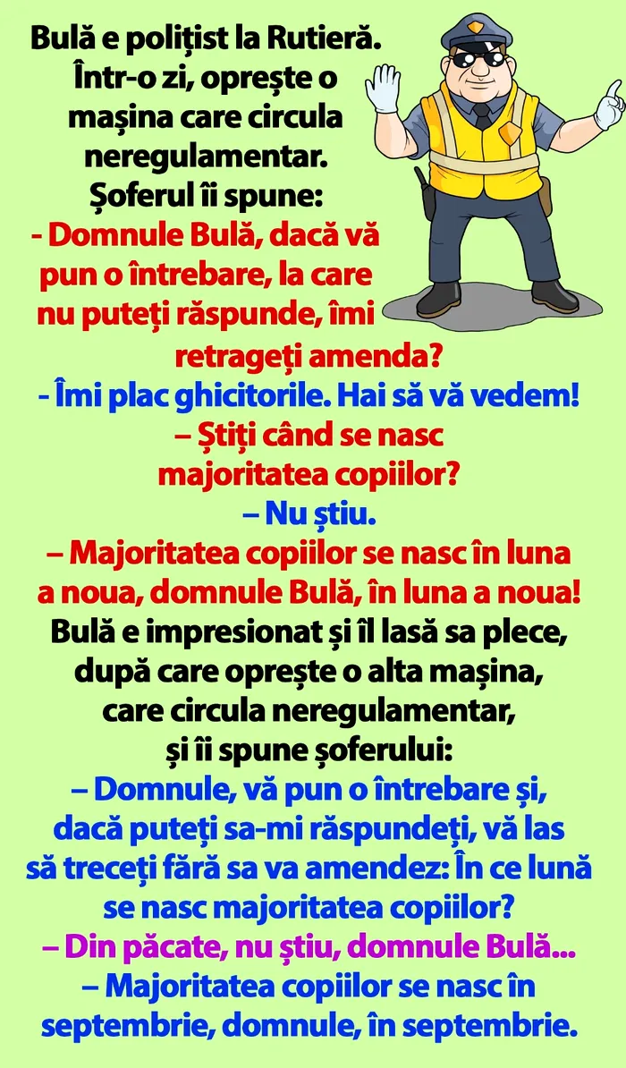 – Domnule, vă pun o întrebare și, dacă puteți sa-mi răspundeți, vă las să treceți fără sa va amendez: În ce lună se nasc majoritatea copiilor?