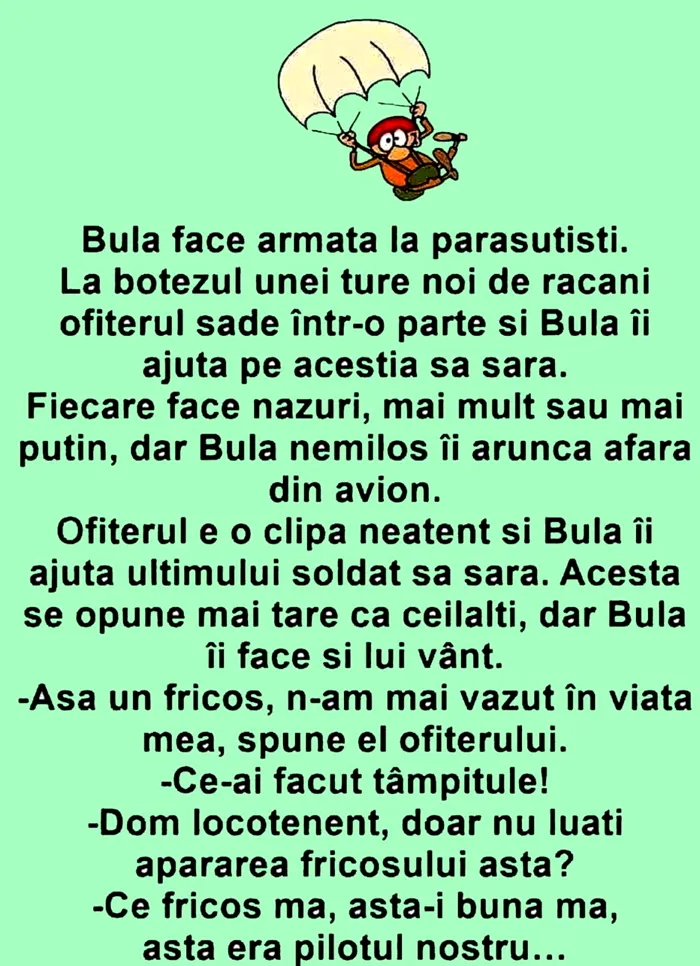 Joi, Gândul vă propune un nou banc „marca Bulă”. De această dată, celebrul personaj face armata la parașutiști. Aflat în avion, cu alți soldați, lucrurile iau o întorsătură total neașteptată. Iată de ce!