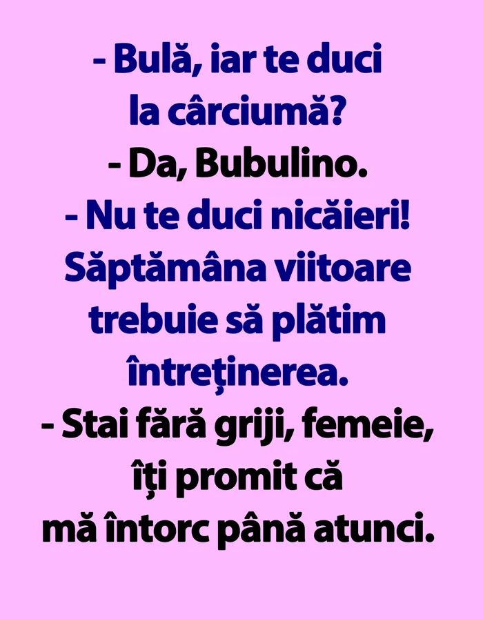 Bancul din acest moment este despre celebrul cuplu Bubu-Bubulina. Mai exact, el vrea să meargă la băut, iar când ea îl ia la întrebări… apar, în mod inevitabil, interdicțiile.