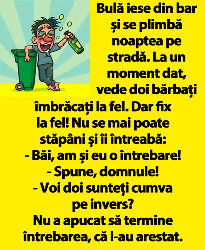 Bulă iese din bar și se plimbă noaptea pe stradă. La un moment dat, vede doi bărbați îmbrăcați la fel. Dar fix la fel! Nu se mai poate stăpâni și îi întreabă: