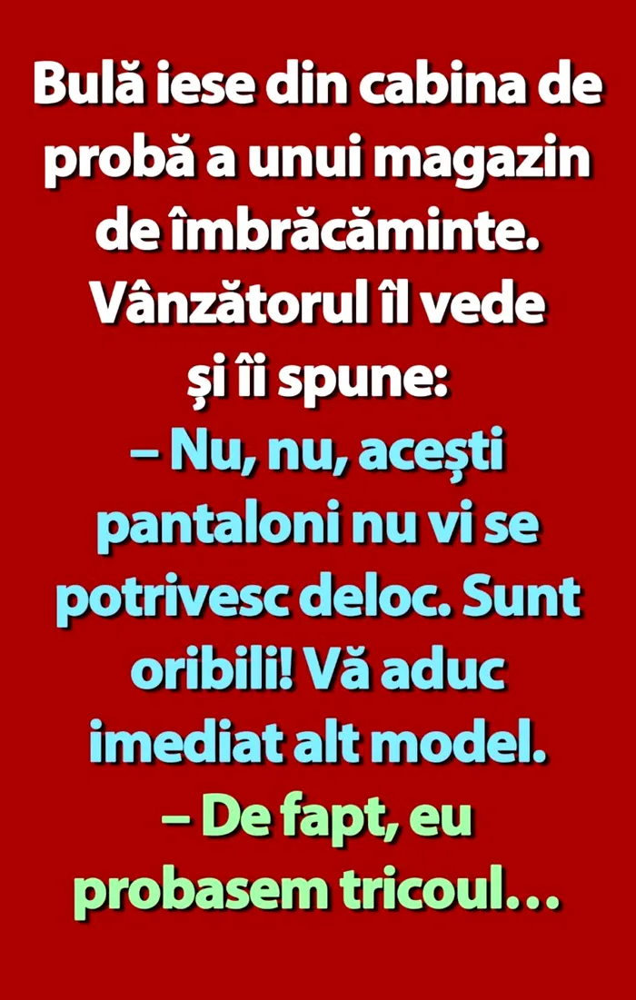 Prima pagină » Bancuri » BANC | Bulă iese din cabina de probă a unui magazin de îmbrăcăminte
