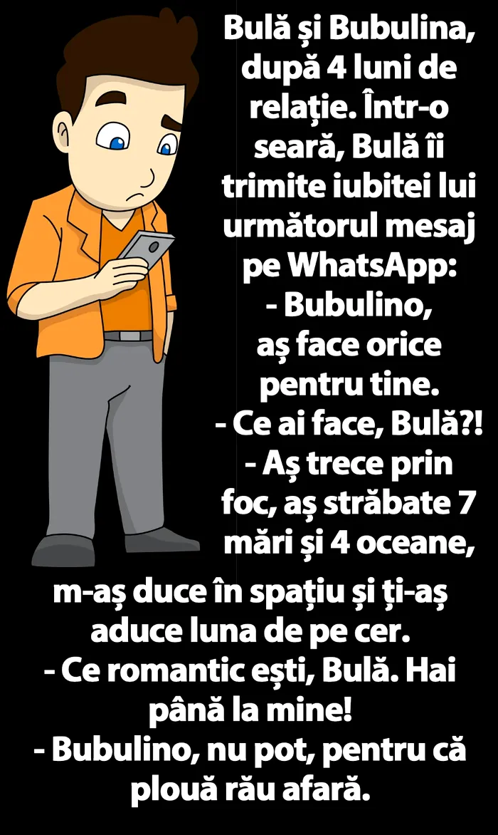 Bulă și Bubulina, după 4 luni de relație. Într-o seară, Bulă îi trimite iubitei lui următorul mesaj pe WhatsApp: