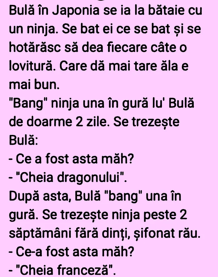 Bulă în Japonia, se ia la bătaie cu un ninja. Se bat ei ce se bat și se hotărăsc să dea fiecare câte o lovitură. Care dă mai tare e cel mai bun. ”Bang” ninja una în gura lui Bulă – doarme două zile. Se trezește Bulă:
