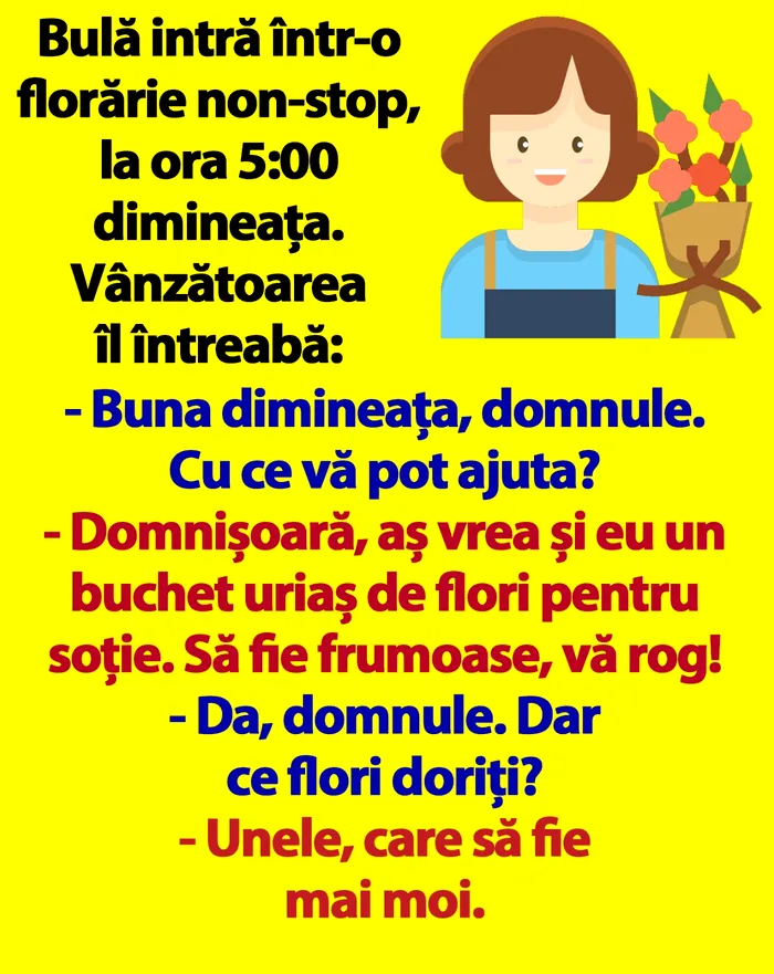Bulă intră într-o florărie non-stop, la ora 5:00 dimineața. Vânzătoarea îl întreabă: