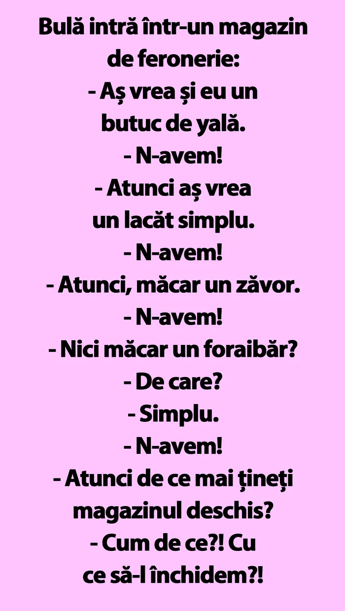 Prima pagină » Bancuri » BANC | Bulă intră într-un magazin de feronerie