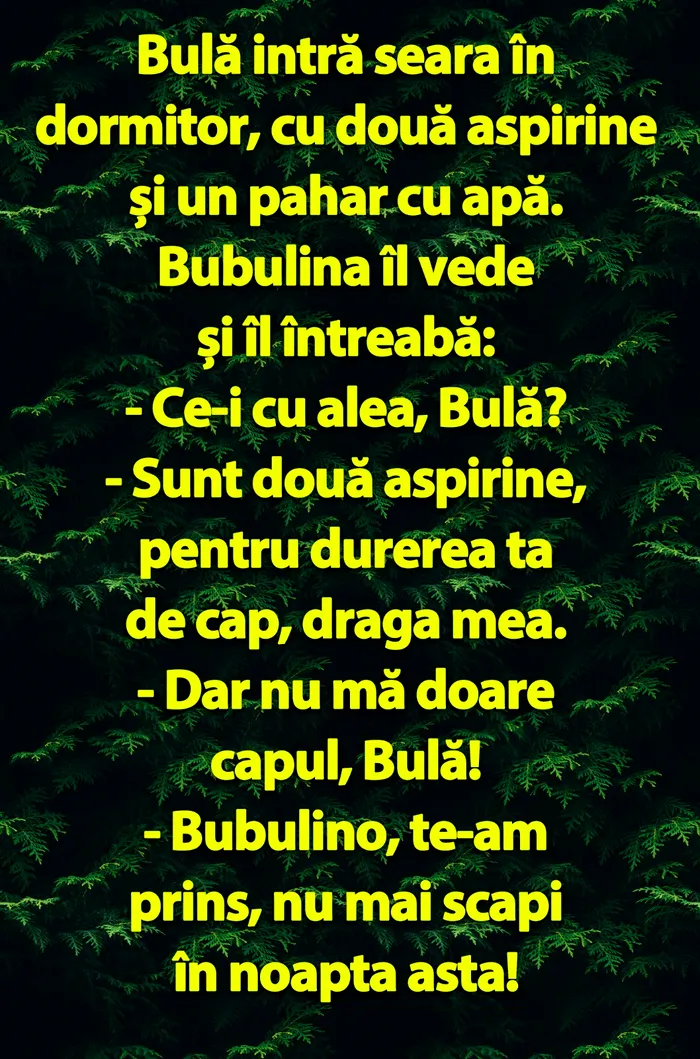 Bulă intră seara în dormitor, cu două aspirine și un pahar cu apă. Bubulina îl vede și îl întreabă: