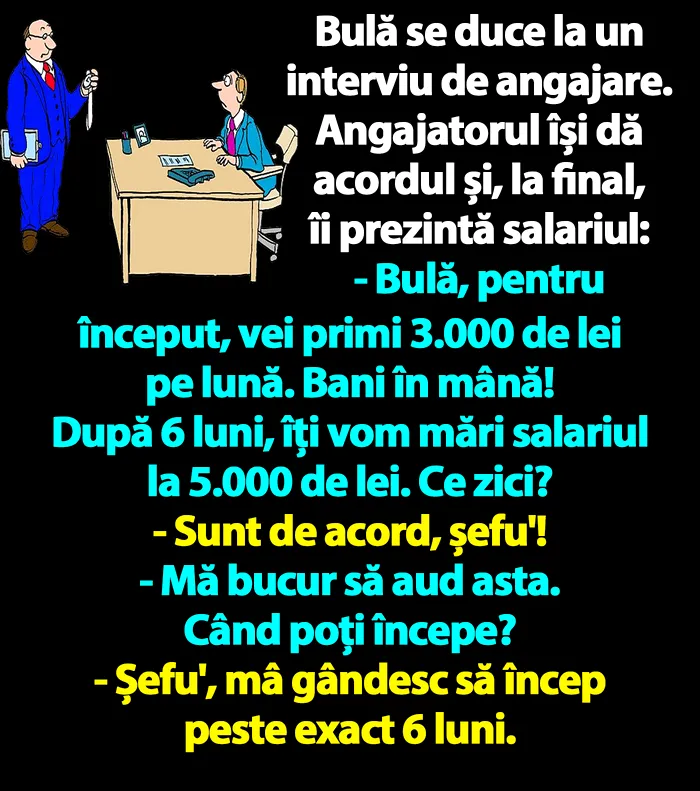 Știți bancul cu Bulă, când se duce la un interviu de angajare? Ei bine, angajatorul își dă acordul și, la final, îi prezintă salariul:
