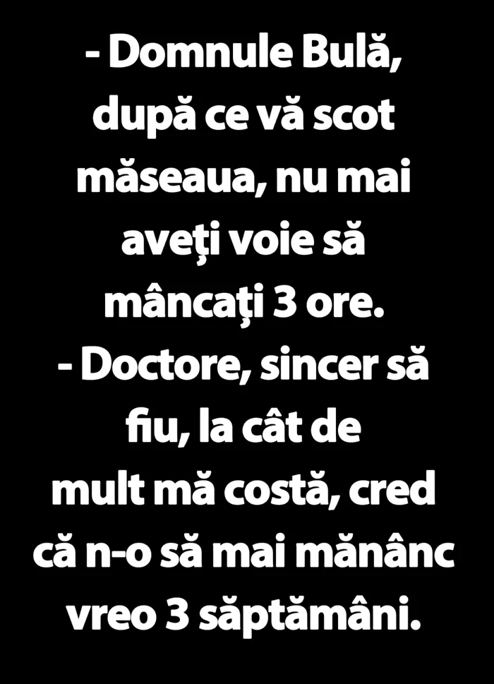 – Domnule Bulă, după ce vă scot măseaua, nu mai aveți voie să mâncați 3 ore.
