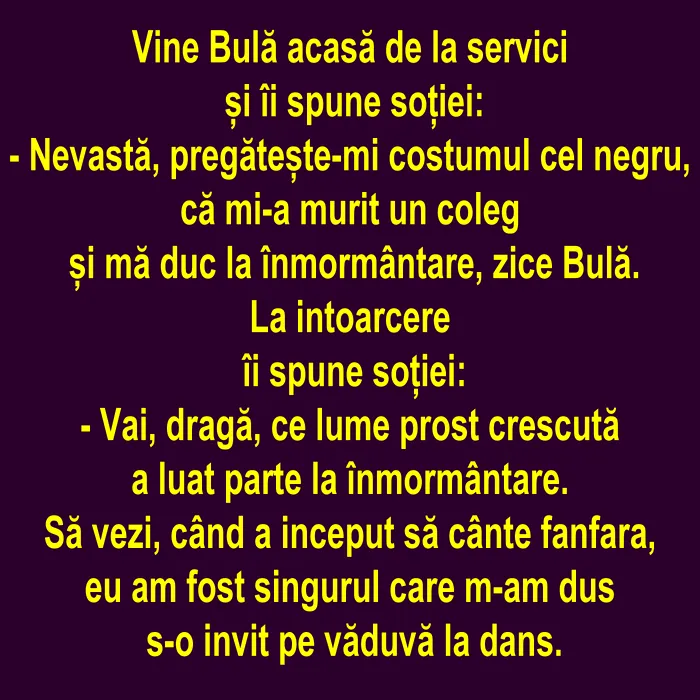 – Nevastă, pregătește-mi costumul cel negru, că mi-a murit un coleg și mă duc la înmormântare, zice Bulă.