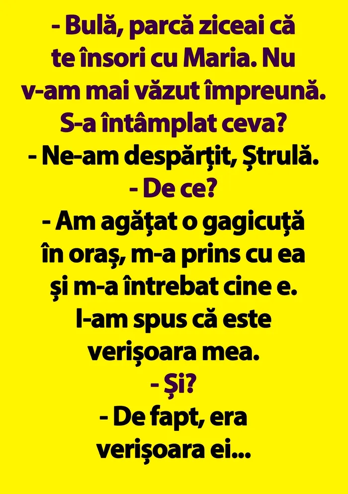 – Bulă, parcă ziceai că te însori cu Maria. Nu v-am mai văzut împreună. S-a întâmplat ceva?