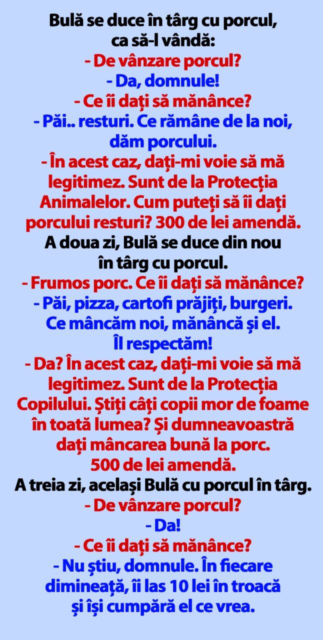 – Da? În acest caz, dați-mi voie să mă legitimez. Sunt de la Protecția Copilului. Știți câți copii mor de foame în toată lumea? Și dumneavoastră dați mâncarea bună la porc. 500 de lei amendă.