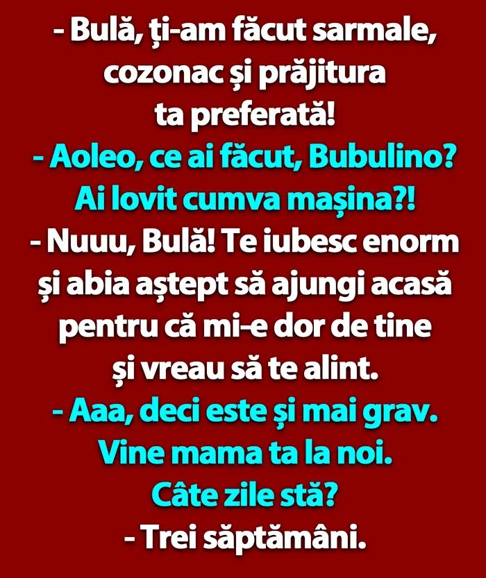 – Aaa, deci este și mai grav. Vine mama ta la noi. Câte zile stă?