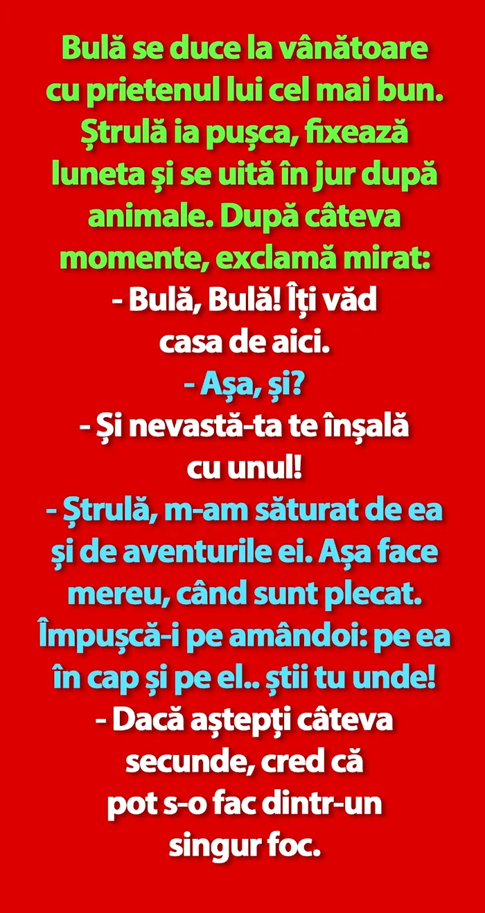 Chiar dacă vremea de afară nu este, poate, ce ne-am dori, GÂNDUL.RO vă propune pentru azi, 25 mai, un banc care să vă binedispună dimineața. Glumele cu Bulă și Ștrulă sunt vechi de când lumea, dar mereu reușesc să ne înveselească.