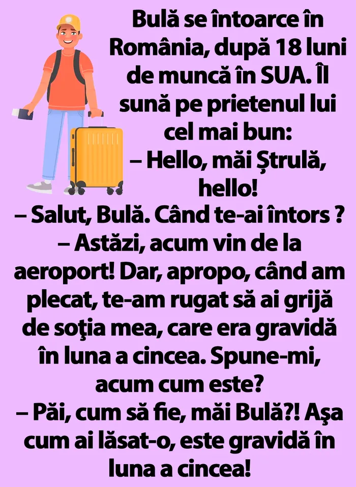 – Astăzi, acum vin de la aeroport! Dar, apropo, când am plecat, te-am rugat să ai grijă de soţia mea, care era gravidă în luna a cincea. Spune-mi, acum cum este?