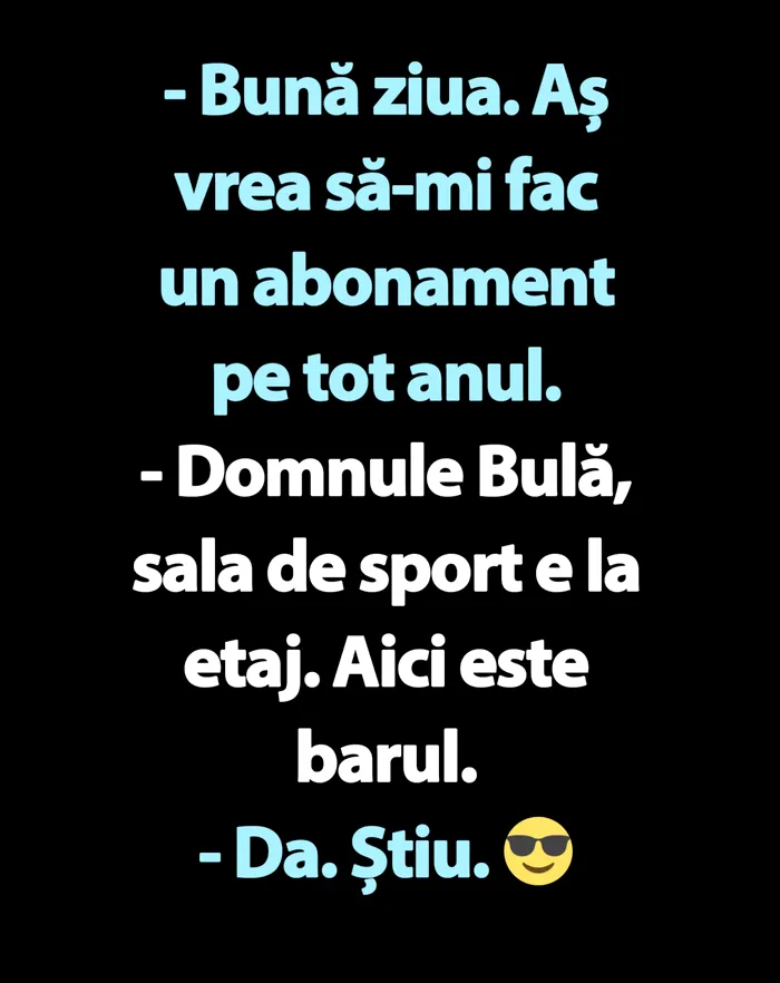 – Domnule Bulă, sala de sport e la etaj. Aici este barul.