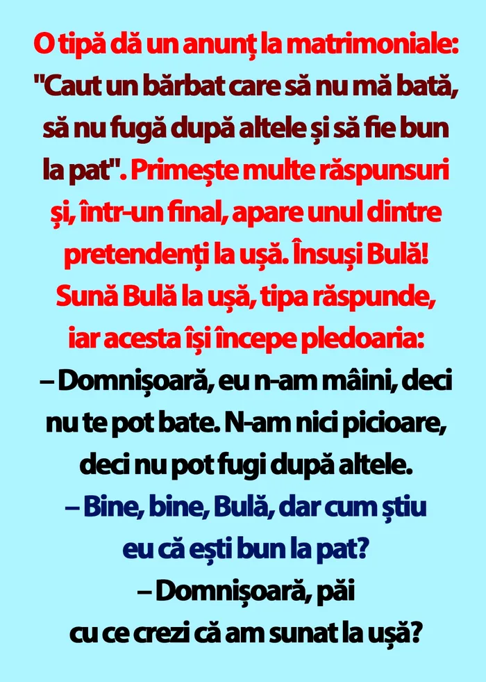 O tipă dă un anunț la matrimoniale: „Caut un bărbat care să nu mă bată, să nu fugă după altele și să fie bun la pat”. Primește multe răspunsuri și, într-un final, apare unul dintre pretendenți la ușă. Însuși Bulă! Sună Bulă la ușă, tipa răspunde, iar acesta își începe pledoaria: