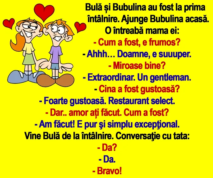 Prima pagină » Bancuri » BANC | Bulă și Bubulina, după prima întâlnire: „Amor ați făcut?”