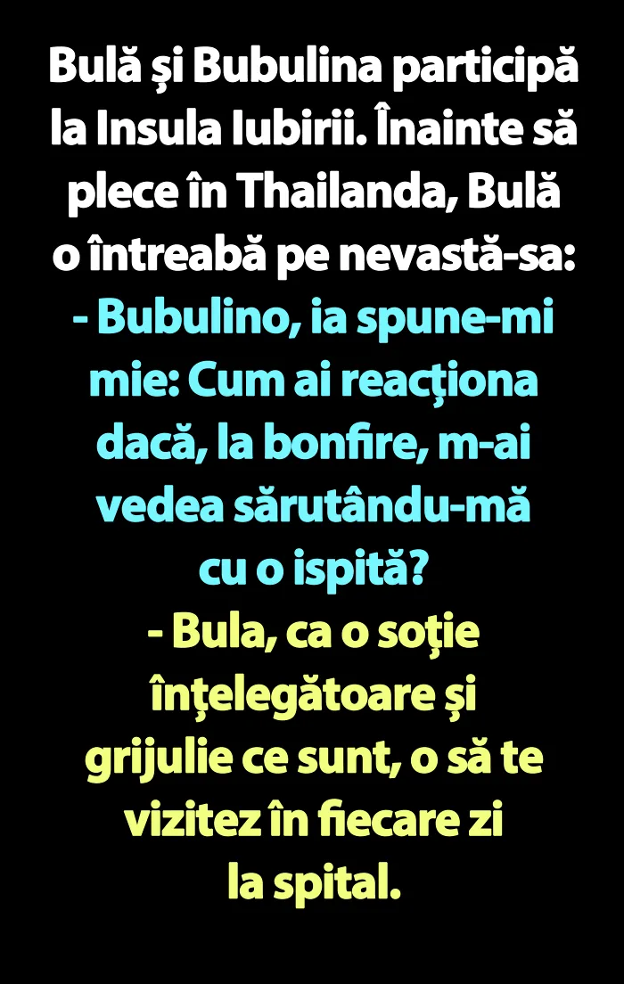 – Bula, ca o soție înțelegătoare și grijulie ce sunt, o să te vizitez în fiecare zi la spital.