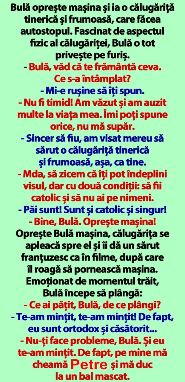 – Sincer să fiu, am visat mereu să sărut o călugăriță tinerică și frumoasă, așa, ca tine.