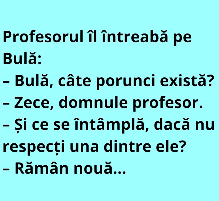 Dacă este joi, vă delectăm cu un nou banc marca Bulă. Profesorul l-a întrebat pe acesta despre cele zece porunci. Răspunsul este unul de-a dreptul hilar.