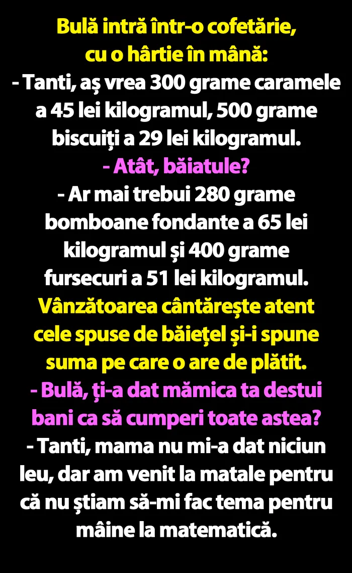 – Tanti, mama nu mi-a dat niciun leu, dar am venit la matale pentru că nu știam să-mi fac tema pentru mâine la matematică.