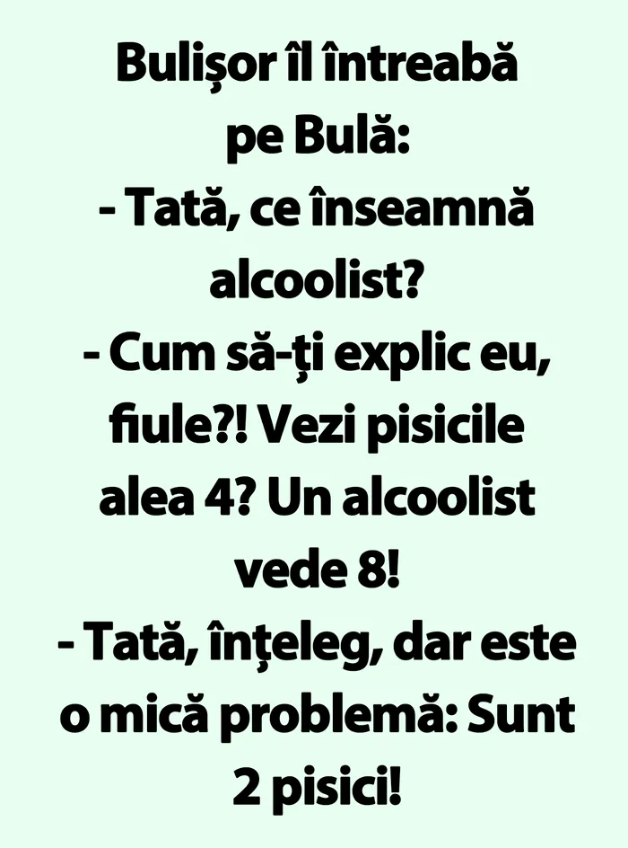 – Cum să-ți explic eu, fiule?! Vezi pisicile alea 4? Un alcoolist vede 8!