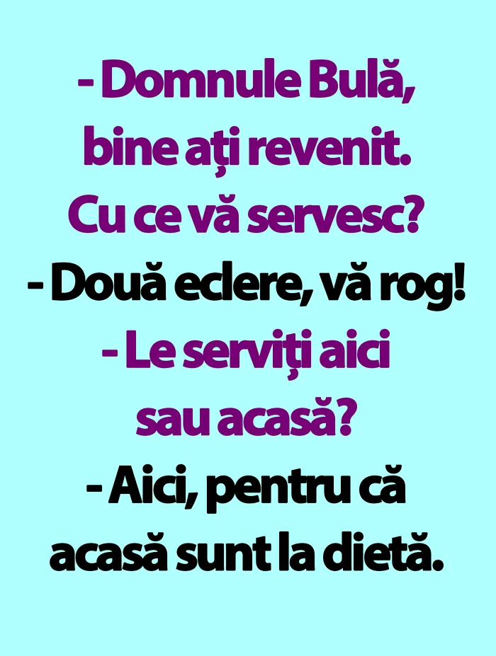 – Domnule Bulă, bine ați revenit. Cu ce vă servesc?